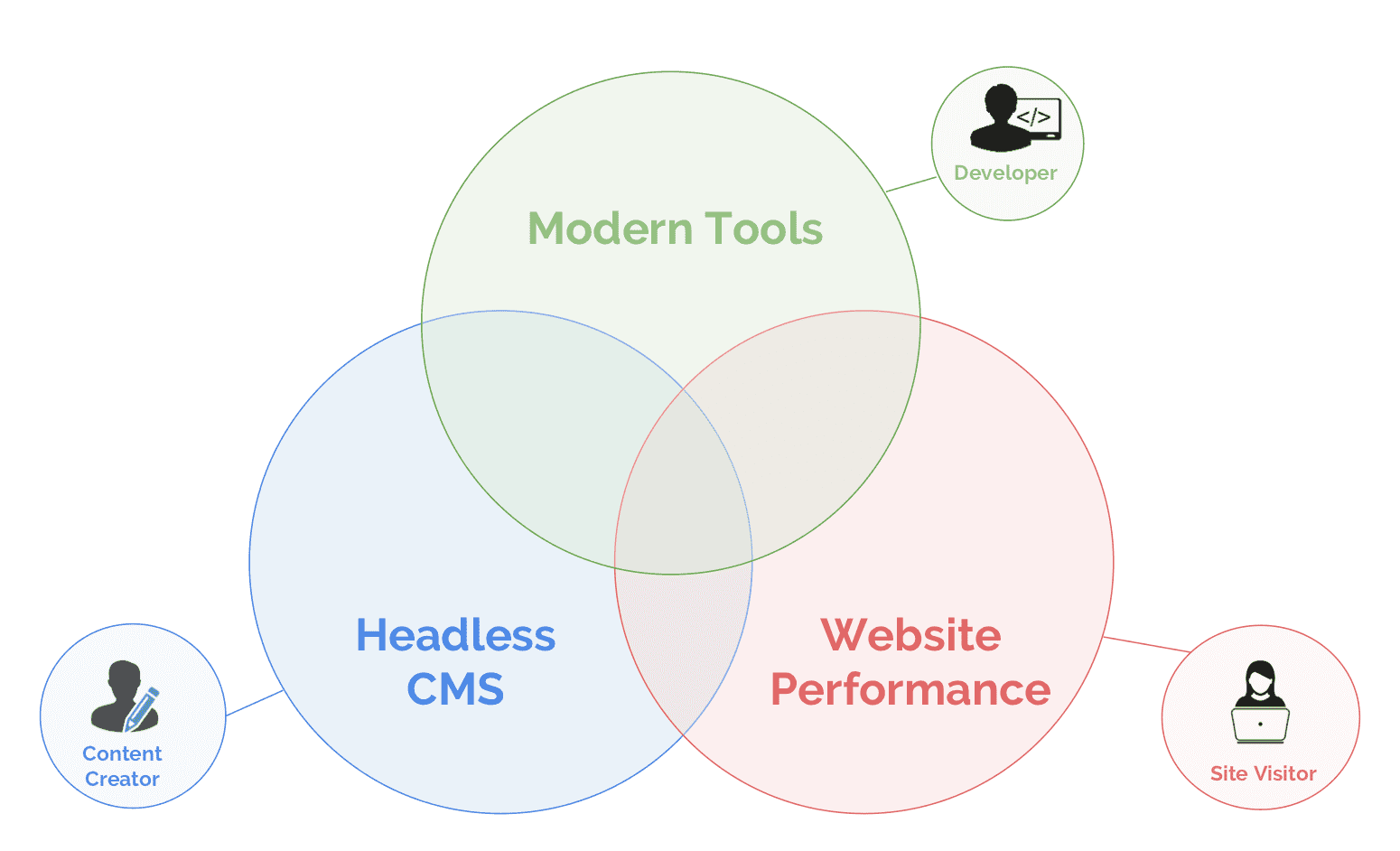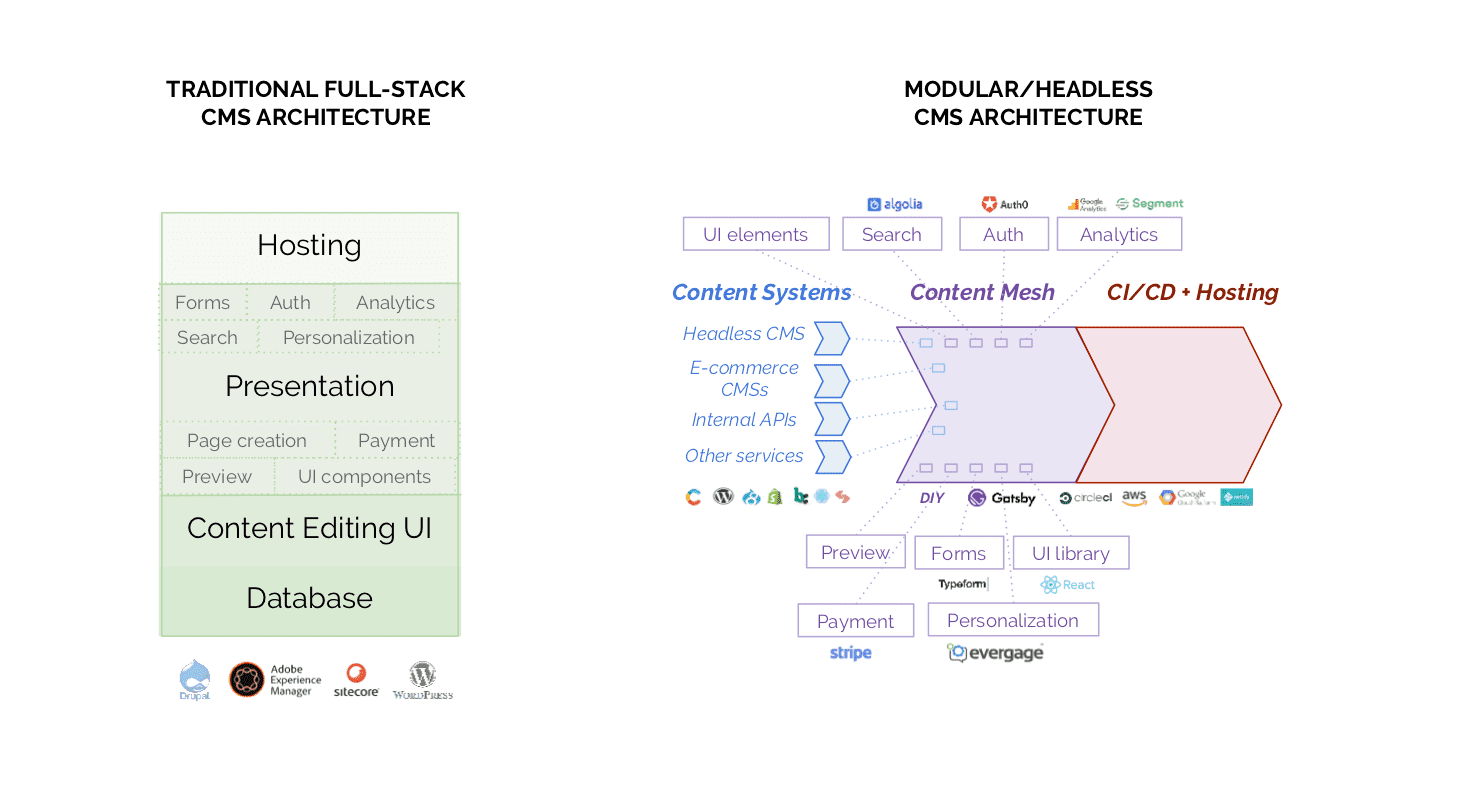 La précédente génération de CMS dédiés aux entreprises offrait souvent une expérience d'édition de contenu générique, basée sur des développement et des environnements de déploiement dépassés. La nouvelle stratégie pour la gestion de contenu tant à ne conserver que les meilleurs solutions, adaptables à des cas d'utilisation spécifiques comme le e-commerce ou le blogging; elle apporte un cadre de travail moderne permettant des itérations rapides et génère des sites web légers et rapides nativement.